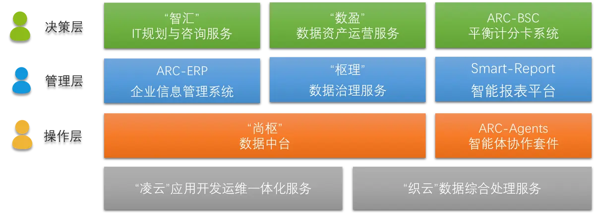 在決策層,“智匯”IT規劃與咨詢服務,憑借專業團隊對行業趨勢和技術生態的深度洞察,為企業量身定制契合發展戰略的IT架構藍圖,明晰數字化路徑;“數盈”數據資產運營服務,挖掘企業數據價值,將分散數據轉化為可運營、能創造效益的資產,驅動業務創新;ARC - BSC平衡計分卡系統,以戰略為導向,從財務、客戶、內部流程、學習與成長等維度,量化指標、監控進度,助力科學決策 。