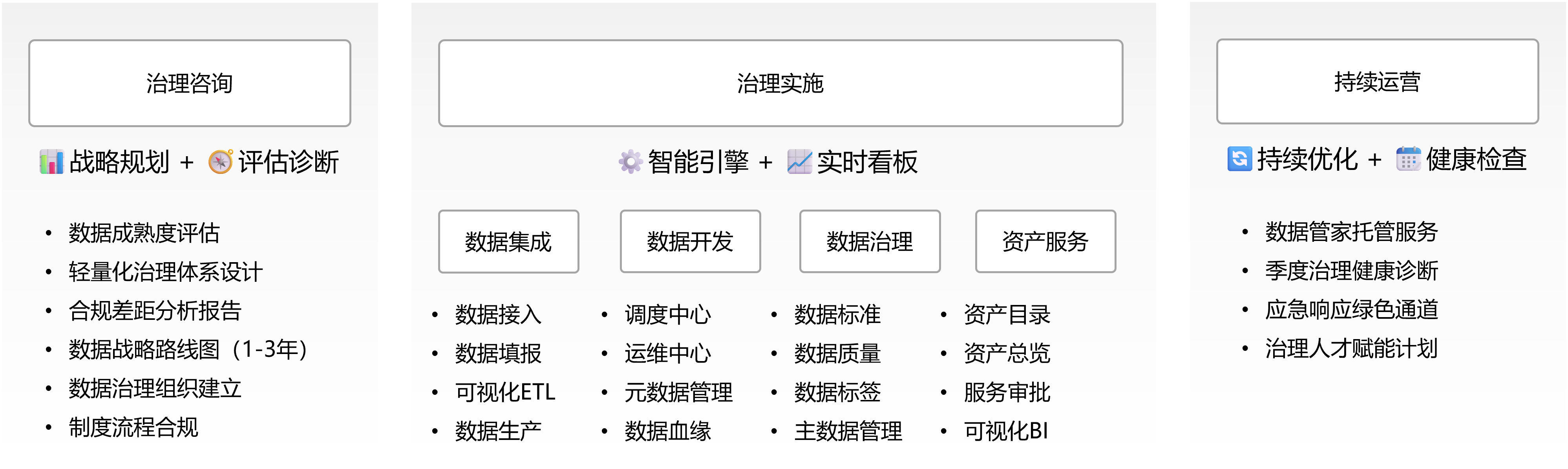 數(shù)據(jù)治理服務(wù)流程圖“樞理”從戰(zhàn)略高度出發(fā),開展數(shù)據(jù)治理咨詢。通過數(shù)據(jù)成熟度評估,精準(zhǔn)診斷企業(yè)數(shù)據(jù)管理現(xiàn)狀;設(shè)計輕量化治理體系,適配企業(yè)規(guī)模與業(yè)務(wù)特性;出具合規(guī)差距分析報告,保障數(shù)據(jù)管理符合行業(yè)規(guī)范。同時,繪制1 - 3年數(shù)據(jù)戰(zhàn)略路線圖,明確長期治理方向;協(xié)助建立數(shù)據(jù)治理組織,厘清職責(zé)分工;規(guī)范制度流程,讓數(shù)據(jù)治理“有章可循”,為后續(xù)治理筑牢頂層設(shè)計基礎(chǔ) 。